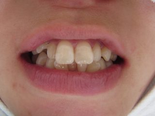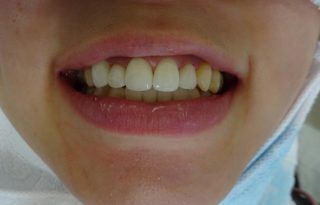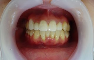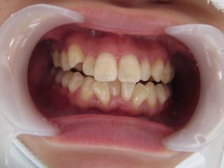 中心から2番目の歯が奥に入っているため真ん中の2本の歯が大きく感じられます。歯が並ぶスペース不足のため歯が重なったり、前後にずれたりしています。