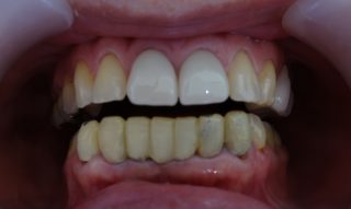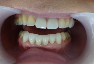 下の前歯の被せ物の劣化による変色と破折、歯の本数が多くバランスや形が不自然で被せ物をやり替えたいとご相談の患者様です。